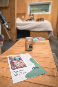 Cabine Astral : écocabine combinant un espace chambre avec lit à deux places, cuisinette, mezzanine en filet, poêle à bois, toilette à compost, immense fenestration pour observer les étoiles et un espace feu de camp extérieur